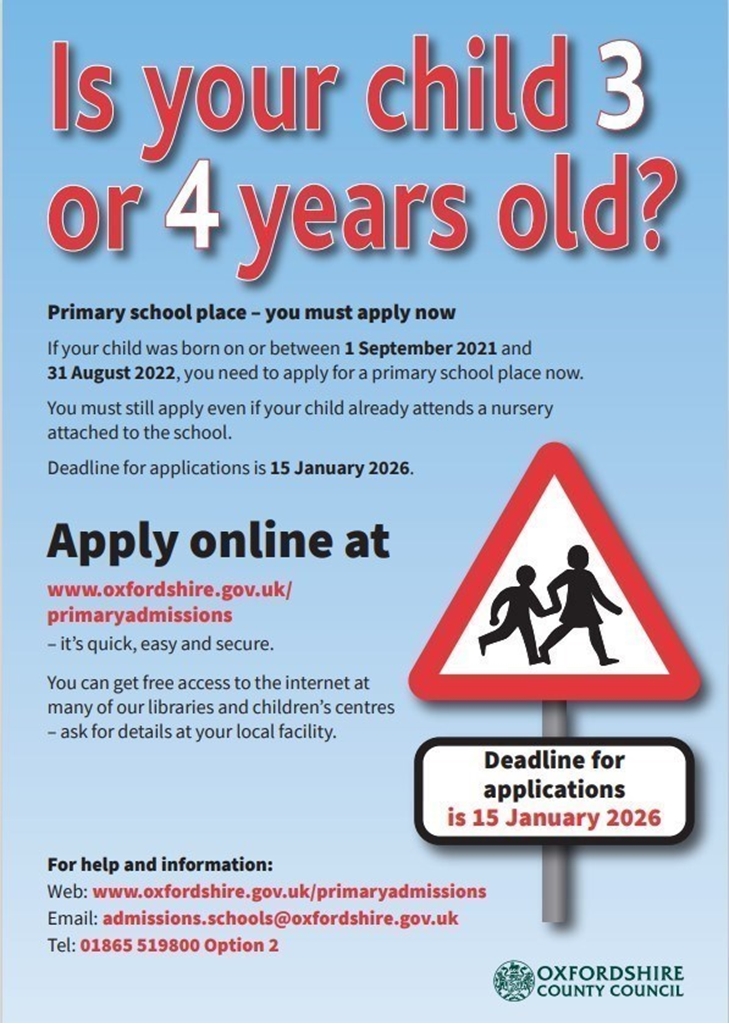 We are writing to let you know that applications for Reception places for children starting school in September 2026 is now open. The deadline for applications is 15 January 2026.