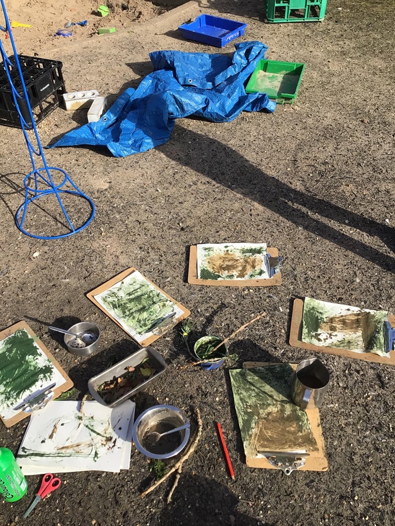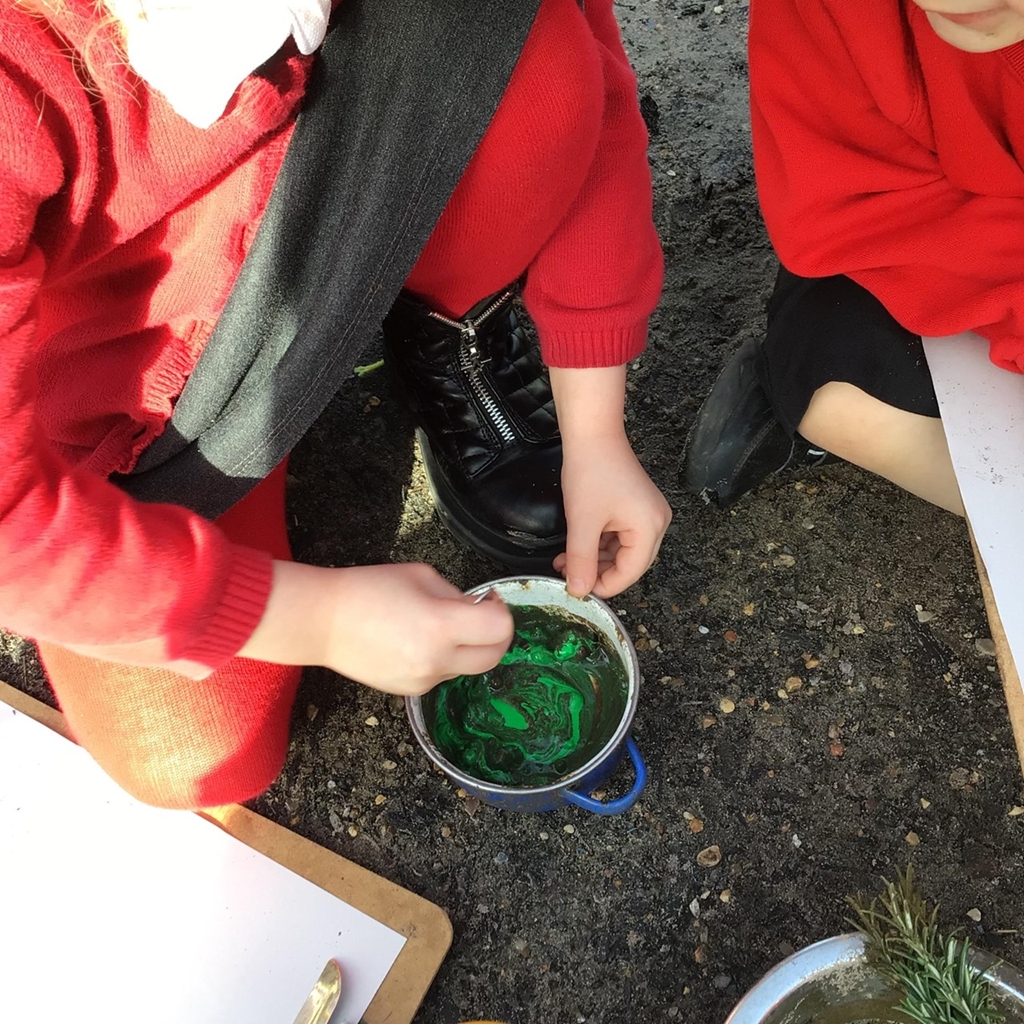 We are making paint in our forest school this afternoon. Gloopy green and brown with mud. We added some water to make it runnier.